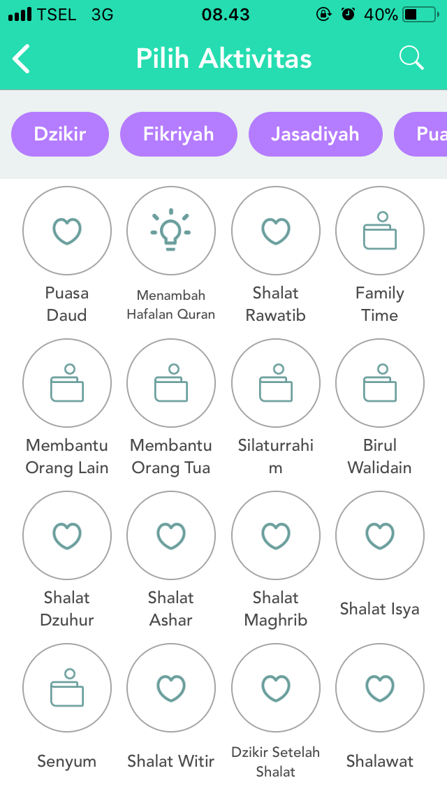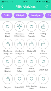 Seperti membaca zikir pagi-petang dan sholat dhuha. Semua ibadah itu dijadwalin dalam sebuah tabel. Jika mencapai target, diceklis. Jika nggak, ya dikosongkan.